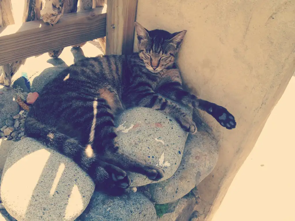 這裡的貓好像都感染了希臘半島上面的哲學性,有些時候光是看著牠們,就可以玩味半個小時。黑灰虎斑貓擅長坐在門口的石頭上,有時候慢慢地望著遠方,手掌懸空了一陣,然後又若有所思地放下來貼著石頭,有時候緩緩地看著你,像是想說「如果宇宙裡有所謂永恆與不朽的話喵~」。另一隻橘白虎斑貓喜歡躲在各種有洞地方,灌木叢間的間隙啦、水泥水管啦、海灘椅底下啦等等,思考「洞的存在理形上的真實性」之類的議題,雖然有時候想著想著就睡著了。