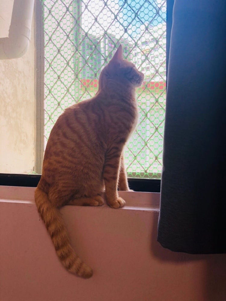 這段時間我們也曾經找能夠領養他的人,但一來他的年紀已經不小,二來他其實很難信任別人,又有攻擊性,要領養他其實是一個考驗。所以他住在天花板住了一陣子之後,終於願意出來和其他的貓咪一起生活。不過大部分的時候,他就這樣坐在窗邊望著窗戶外面的景色,有些時候是看著電線上的鳥,若有所思地看一個早上。