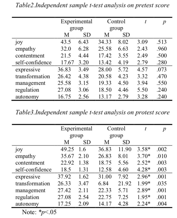 - 這篇就是我今天玩的一些遊戲,使用的是大的樂高積木,叫做「得寶」(Duplo),不過它的研究參與者是學生,在實驗之後控制組都增加了一些正向的心理狀態,細節請看下面的表(截取自此論文):Harn, P. L., & Bo, S. H. The Effectiveness of Playful Positive Psychology Interventions with Six Bricks and DUPLO® Play Box for Taiwan Children on Emotional Adaptation.