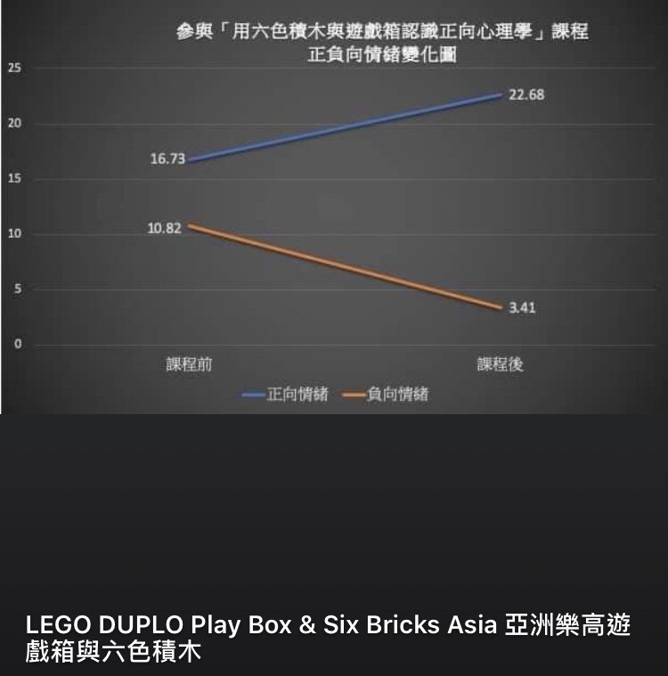 - 台灣近期的研究也顯示,在進行活動之後,高中生整體正向情緒的提升(下圖截取自「亞洲樂高遊戲箱與六色積木」粉絲專頁)