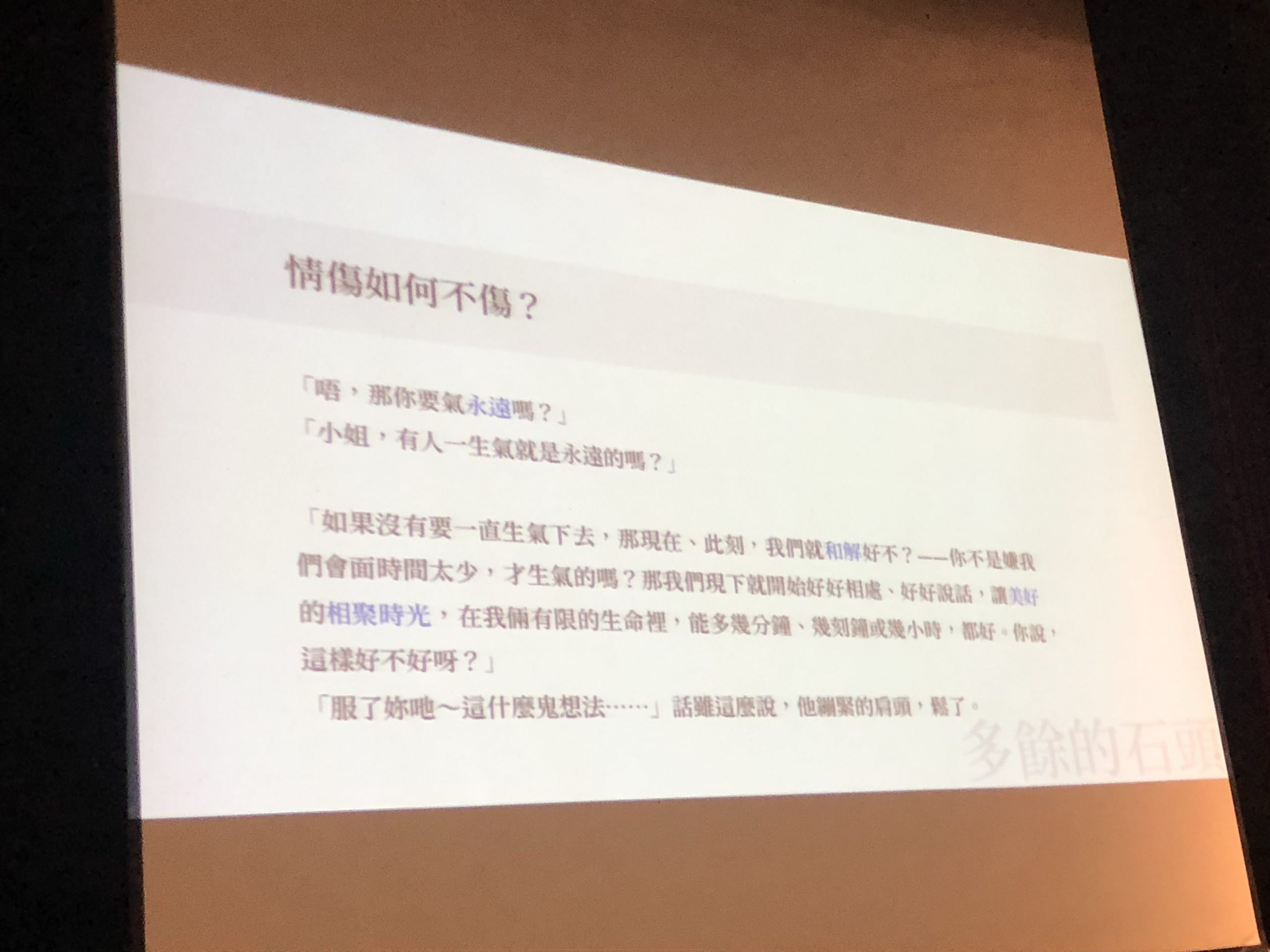 - 但同時你也要思考一件事情,你跟他在一起真的有變好嗎?還是越變衰老?你願意跟他坦承你內心的感受嗎,還是把這些感覺都藏起來不給他知道?我常說靈魂的相遇如兩團揉捏的紙,熱戀期的時候兩人都是沸水,但你早晚會認識你沒看過的他的一部分。衝突,是讓彼此看到靈魂的角落,拓展你的版圖。