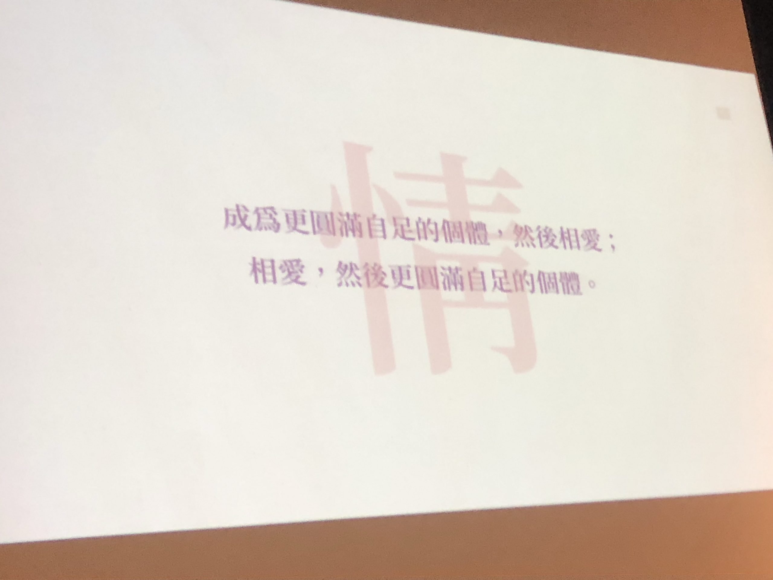 - 像我一個「愛到最後覺醒」的學生,在期末的時候跟我說他打算放棄他的伴侶,原因是因為他終於發現「如果我給他的愛是20000瓦,但他回應我的是5瓦。」,他的這個體悟多麼重要,意味著你真正你要愛上的一個人靈魂,而不是愛上一個人的臉。